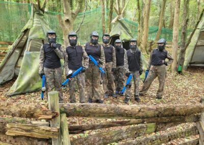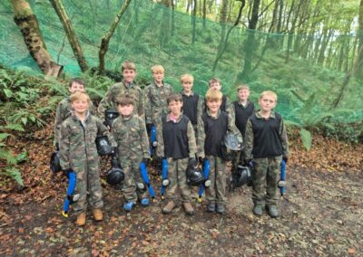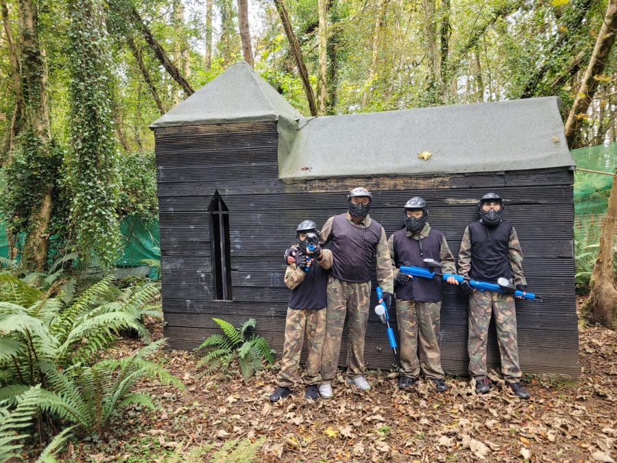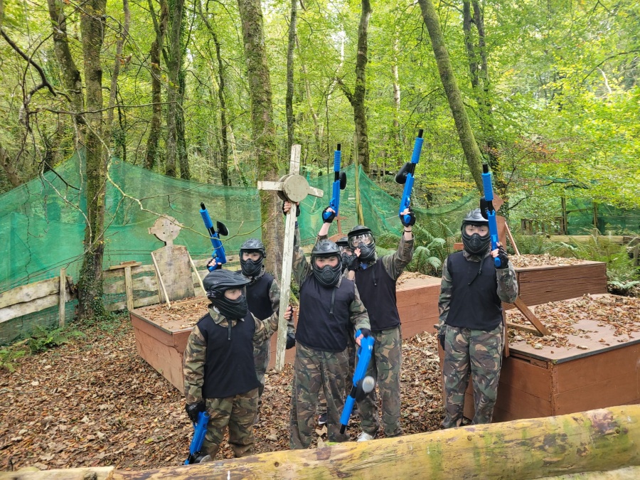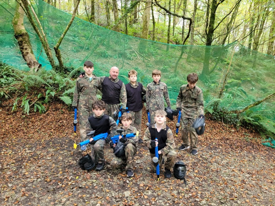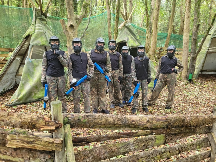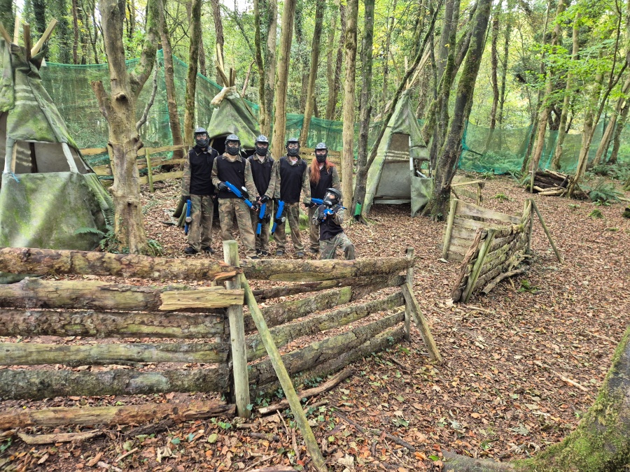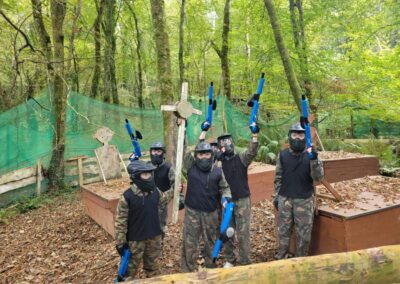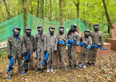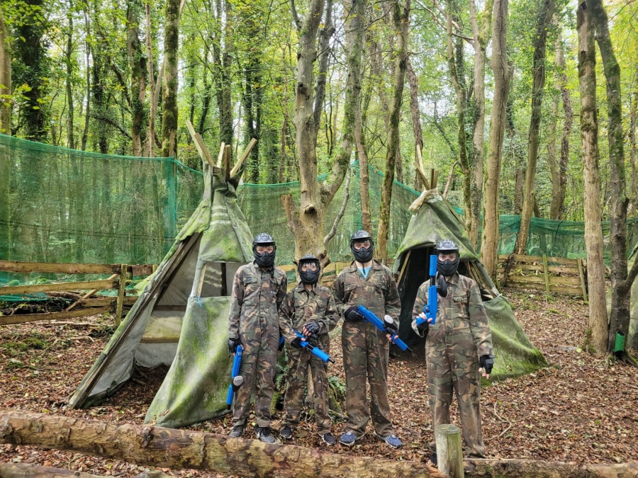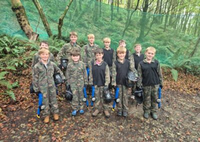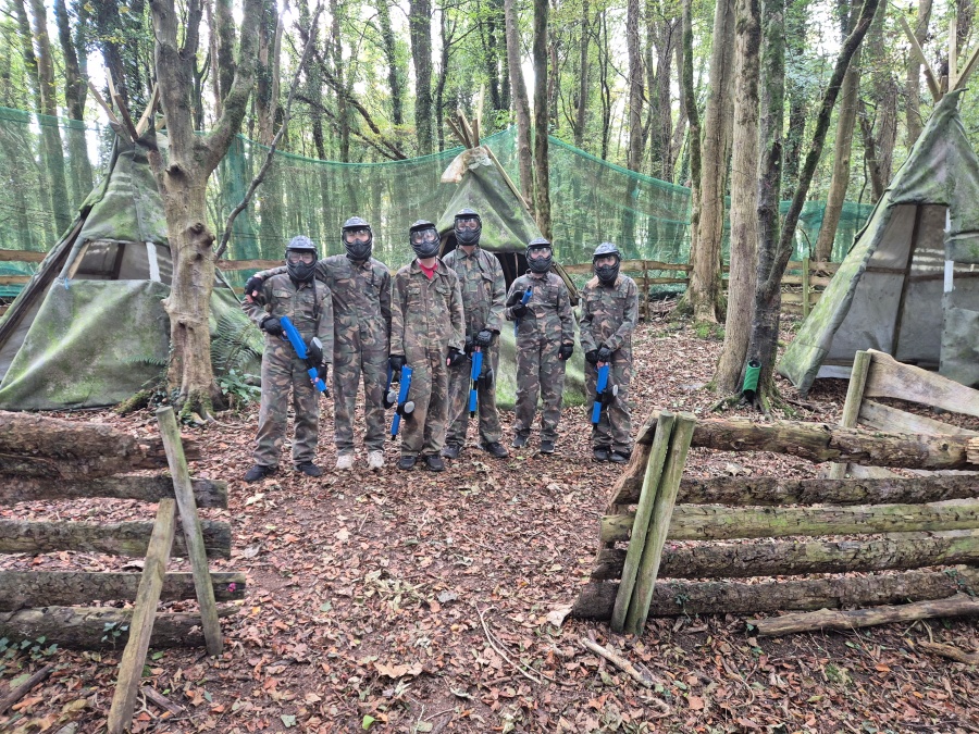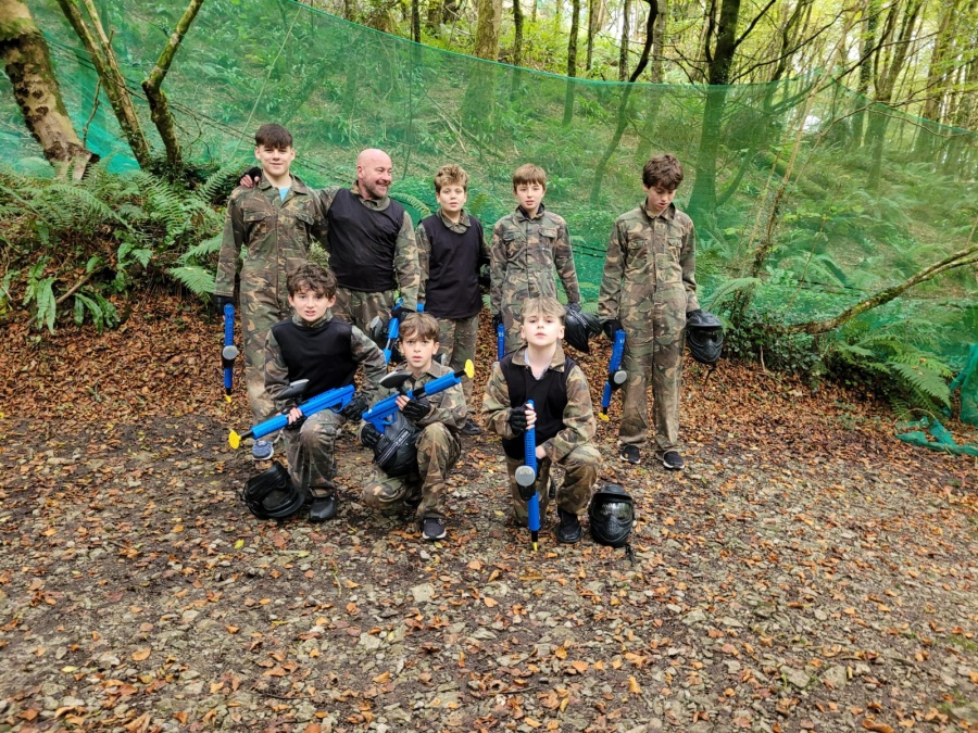 Group of boys and an adult in paintball gear pose for a photo in a wooded area.