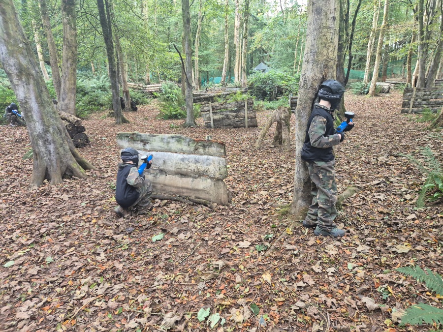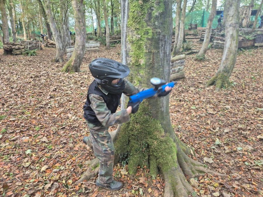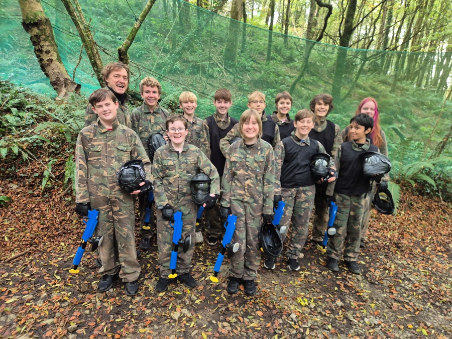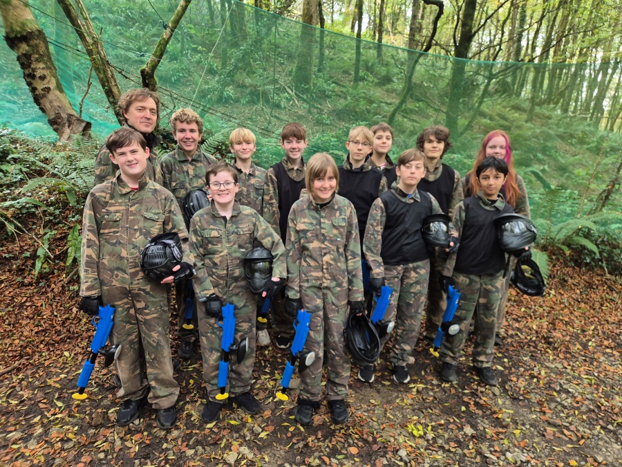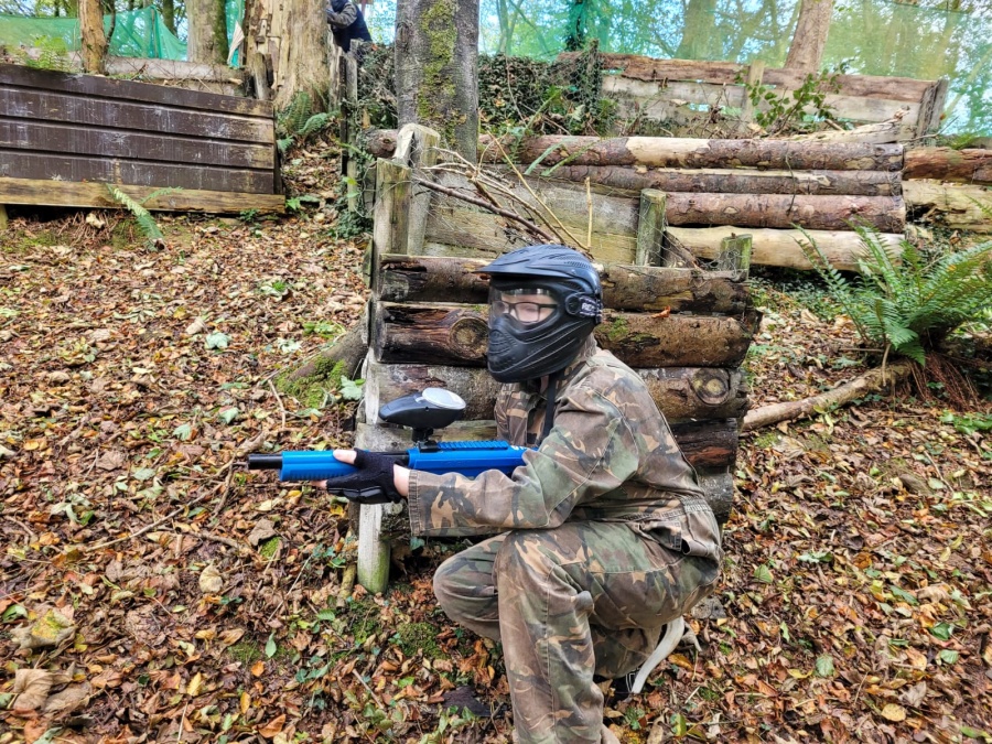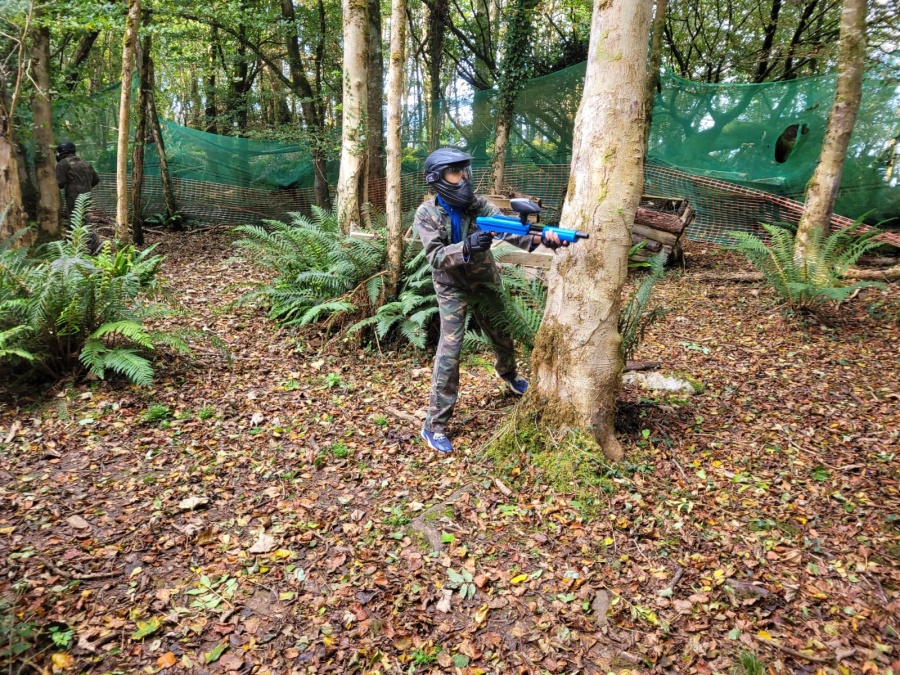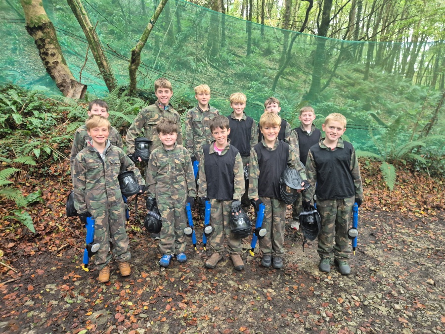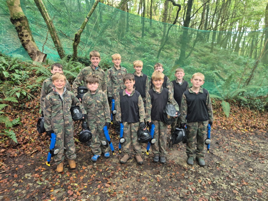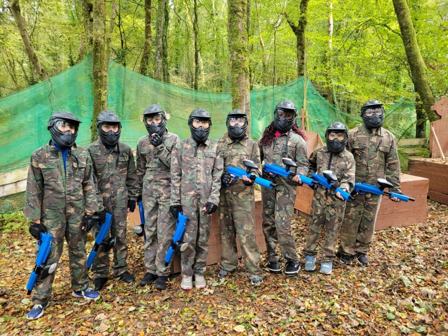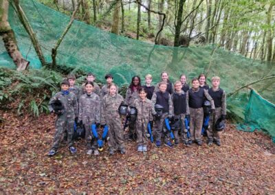 Group of boys and an adult in paintball gear pose for a photo in a wooded area.