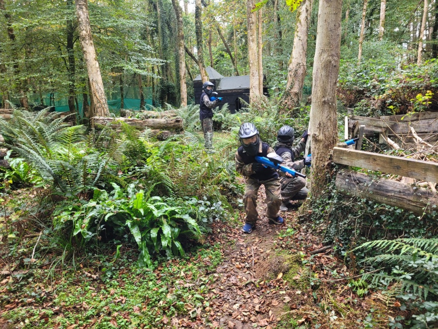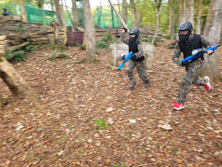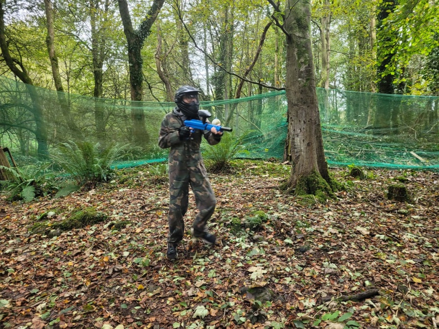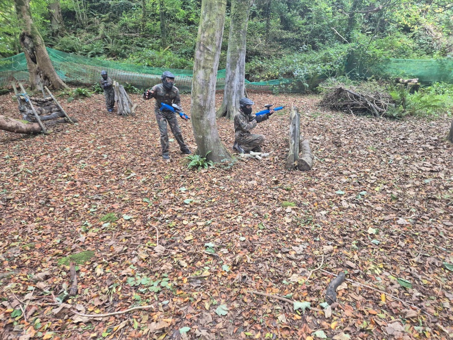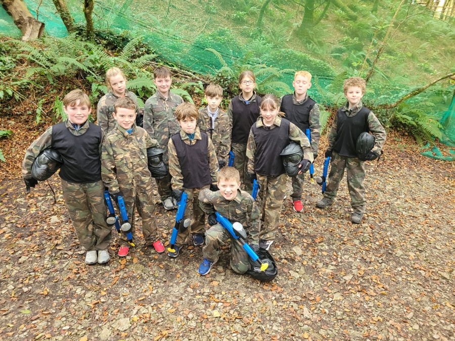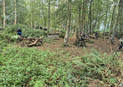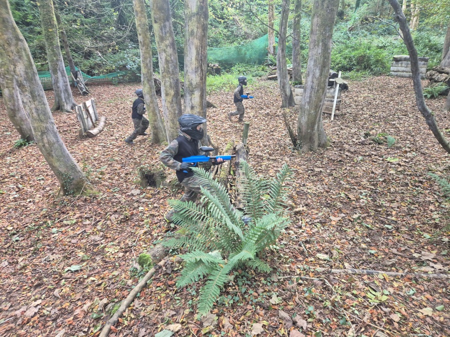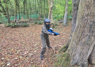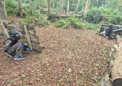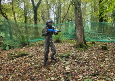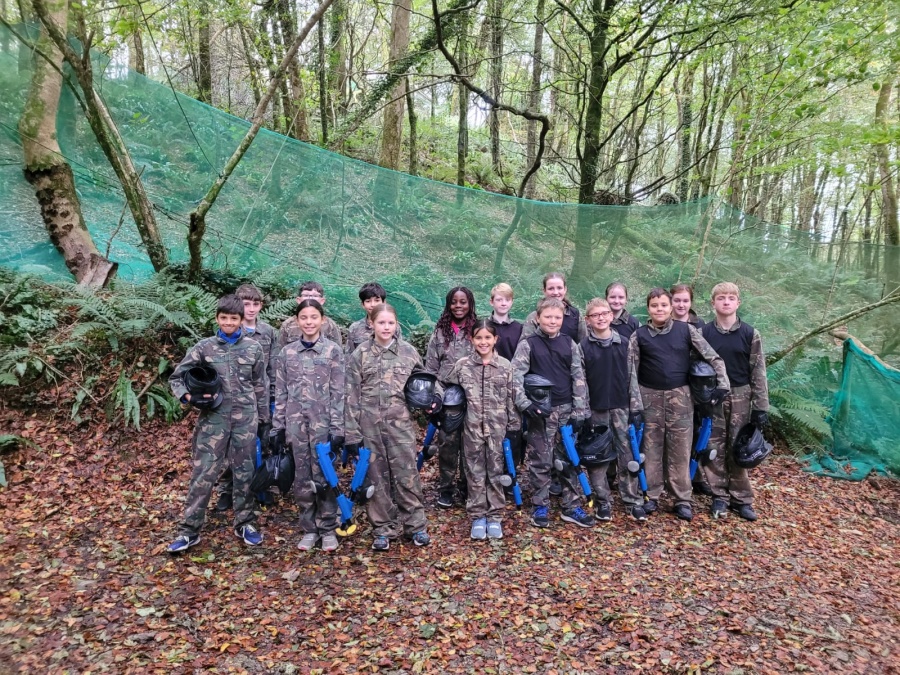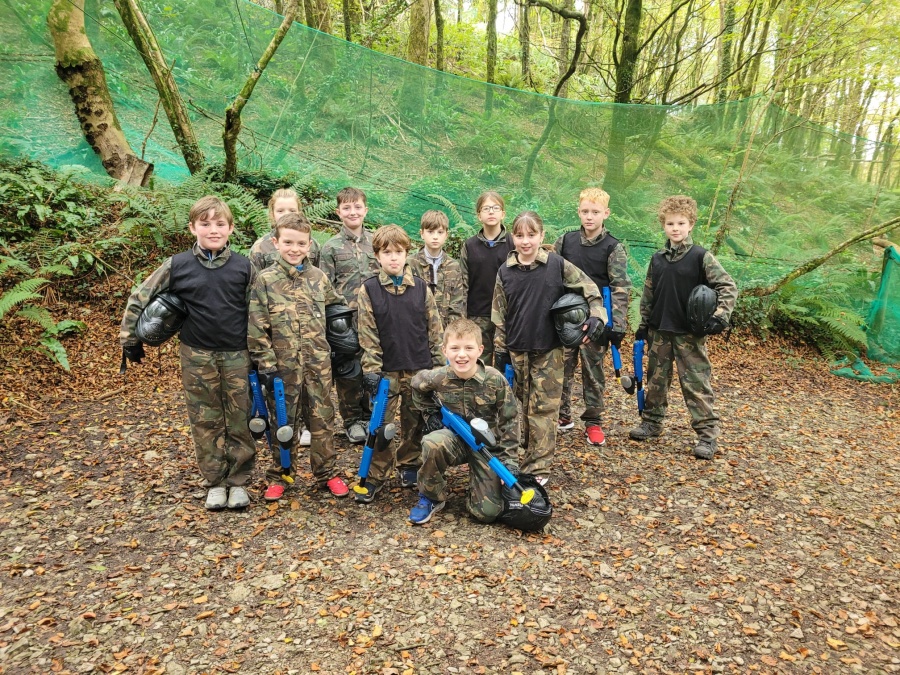 Group of boys and an adult in paintball gear pose for a photo in a wooded area.