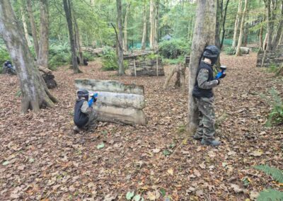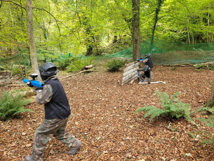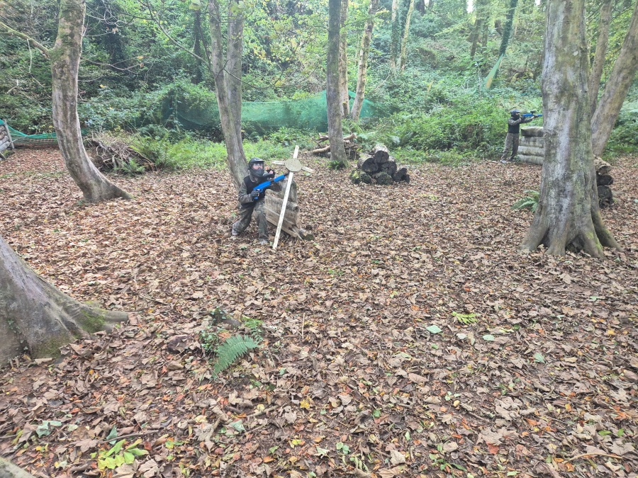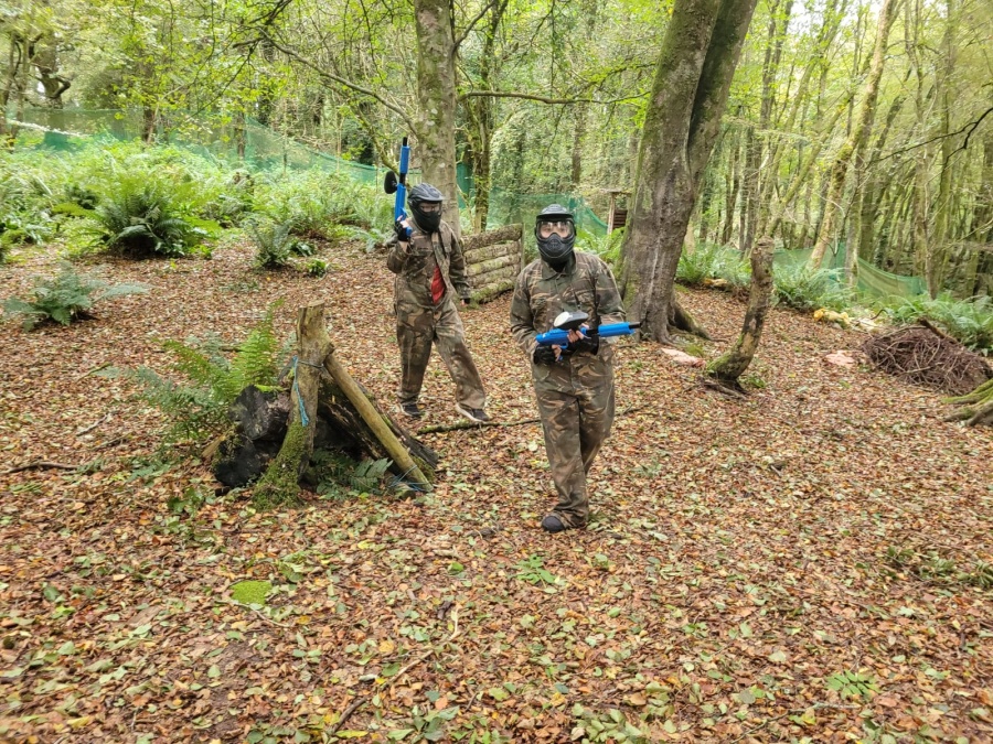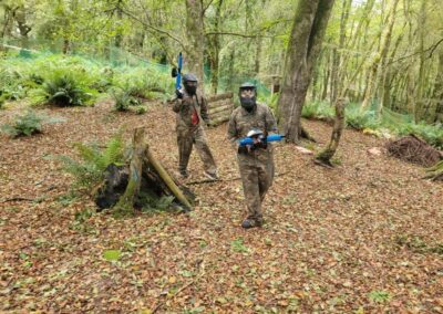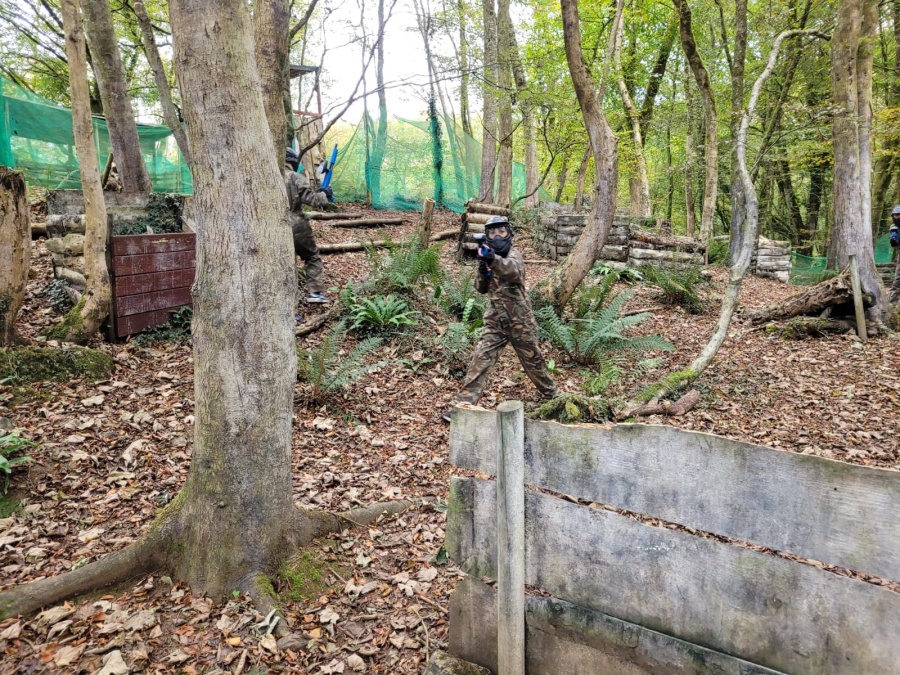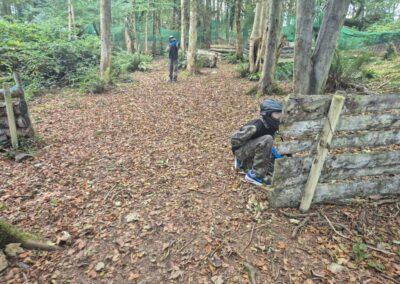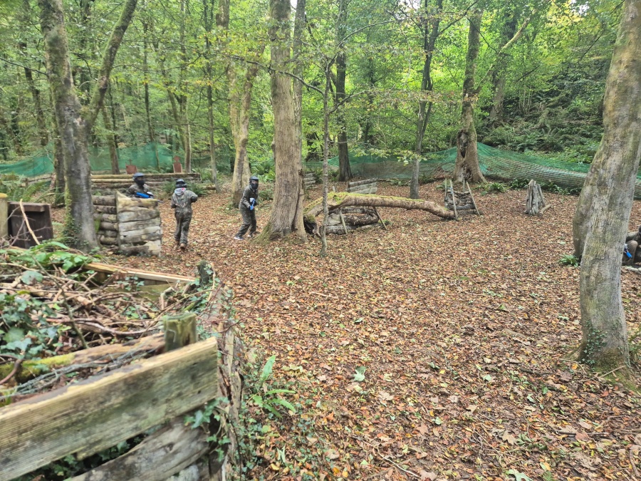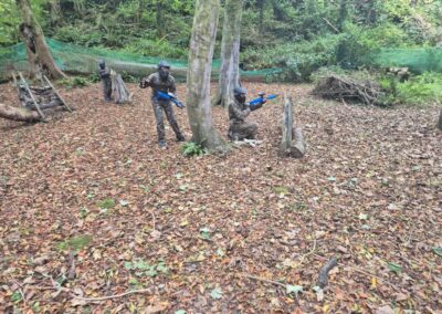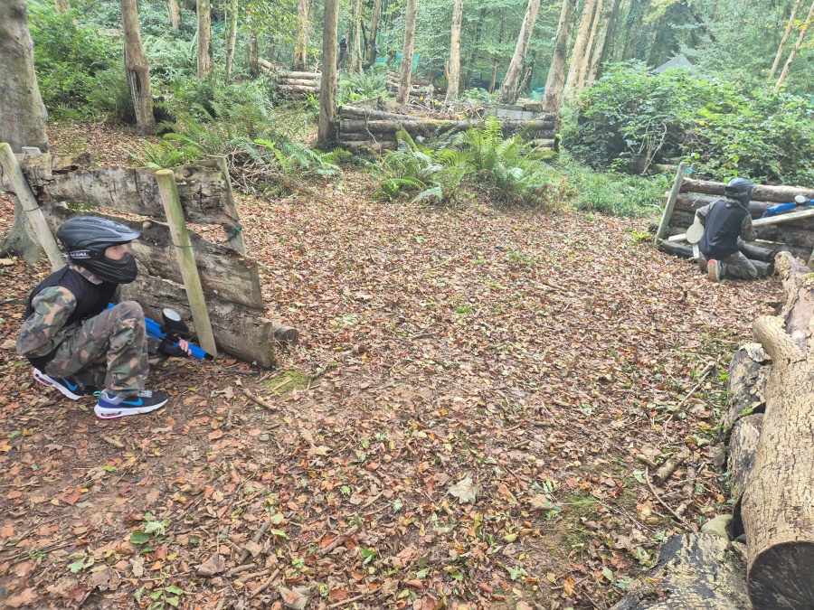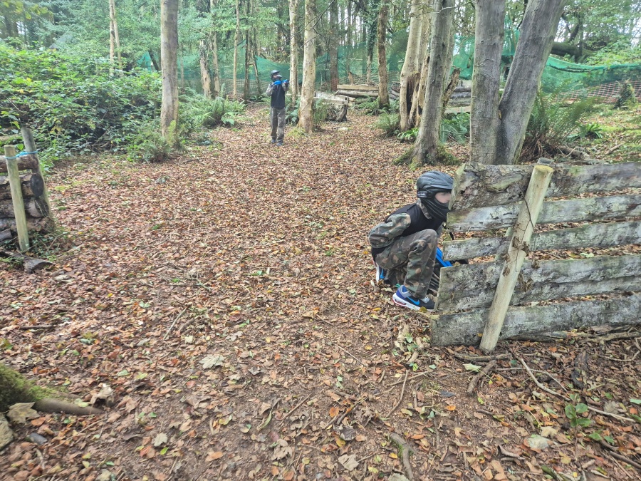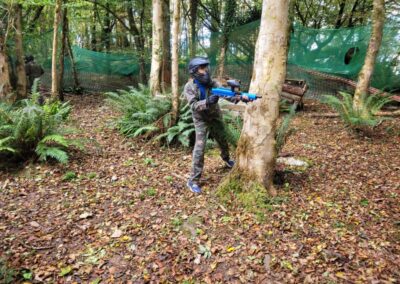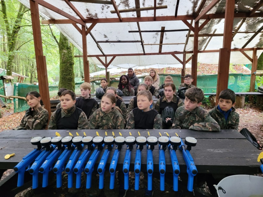 Group of boys and an adult in paintball gear pose for a photo in a wooded area.