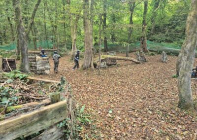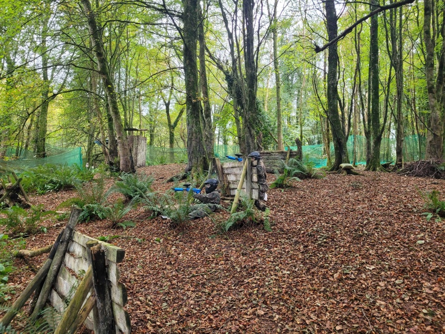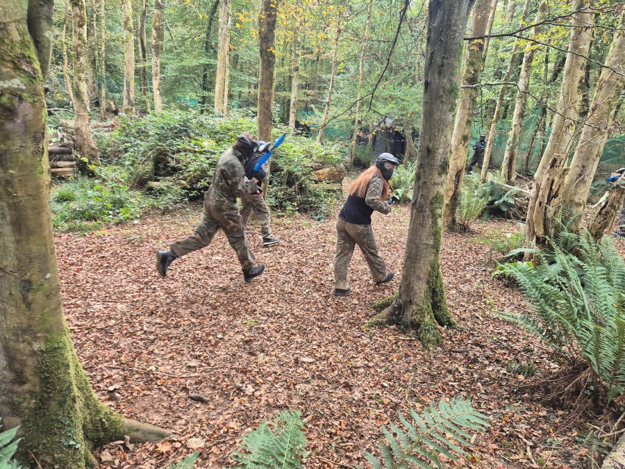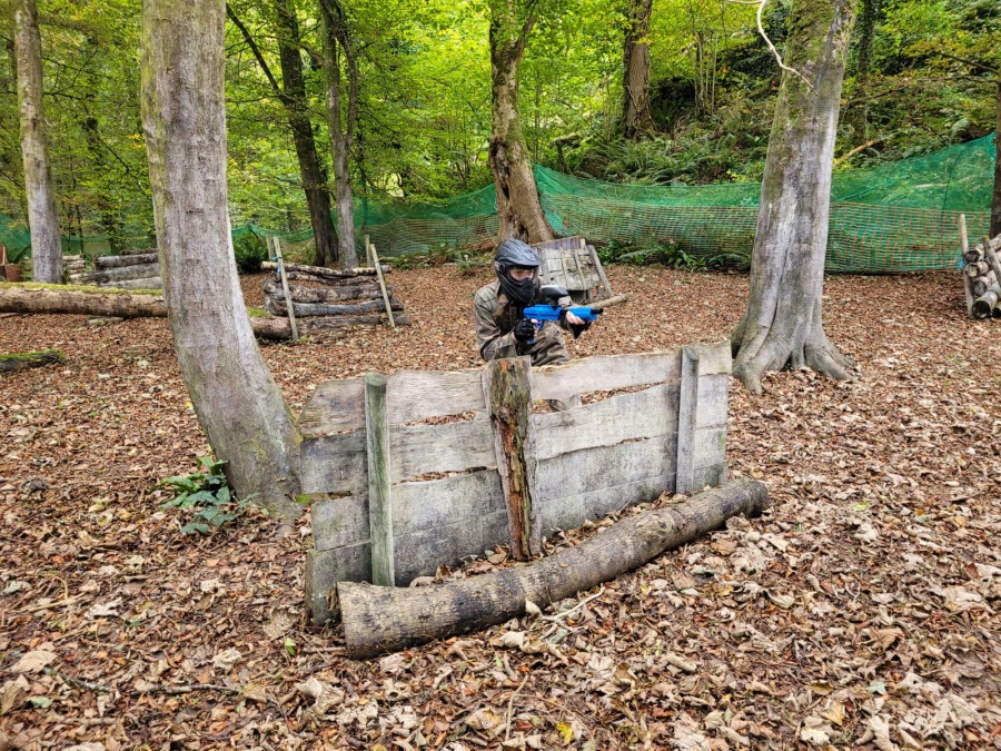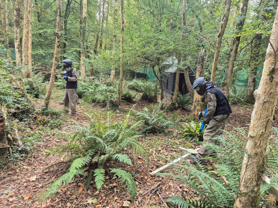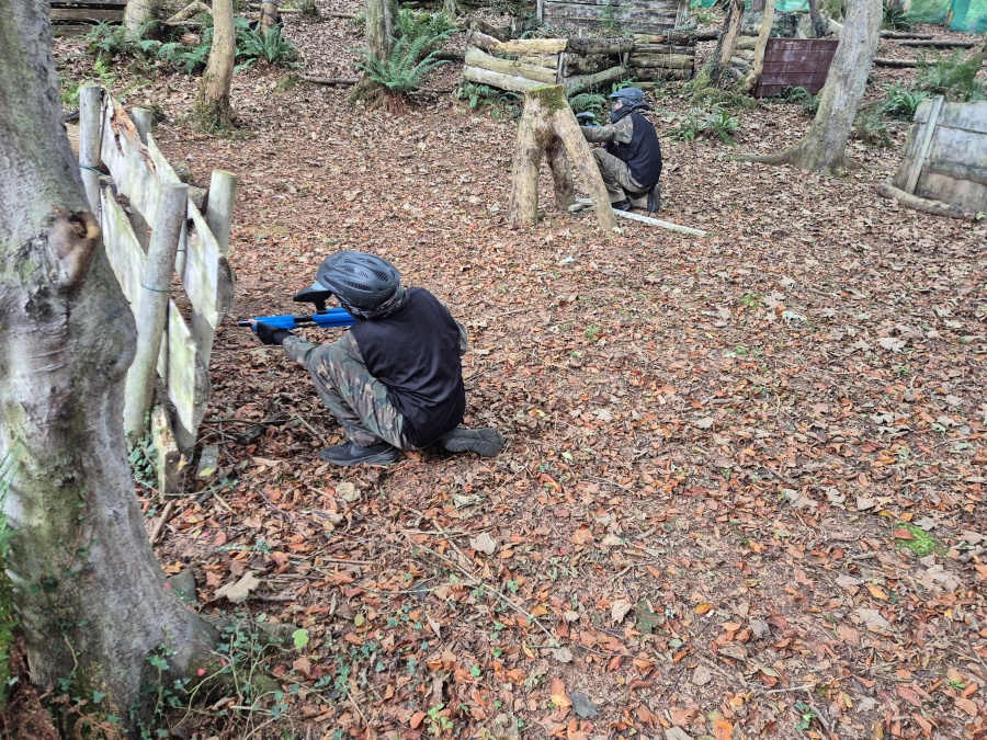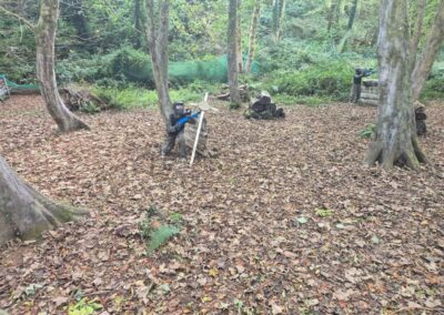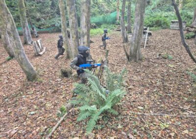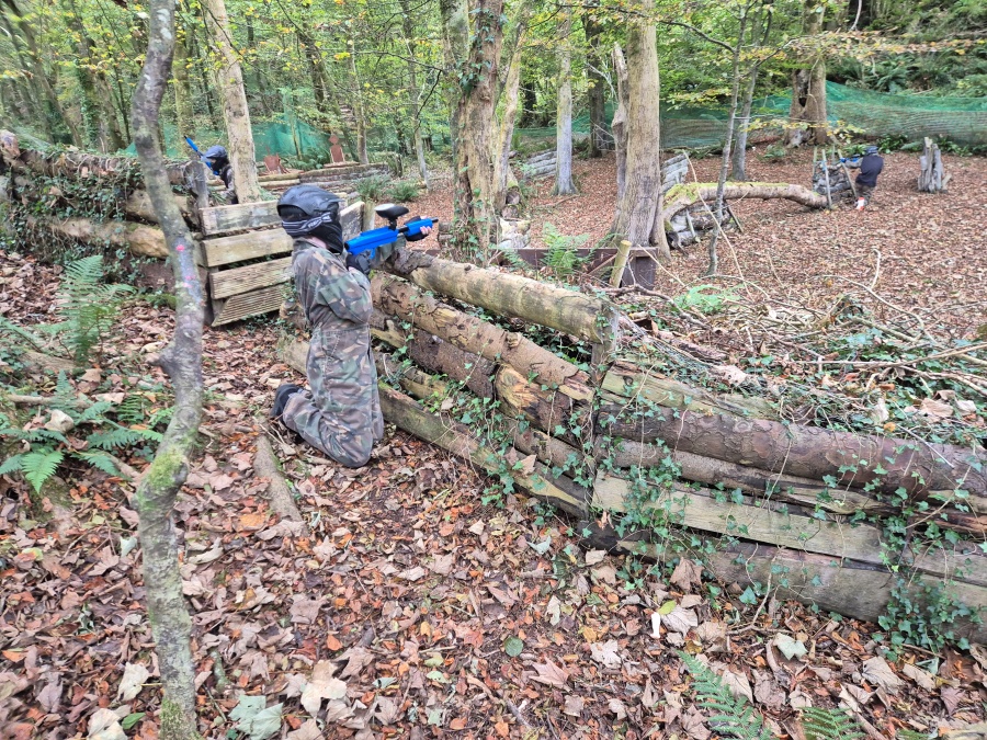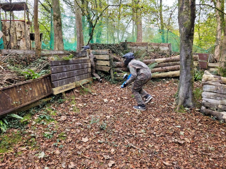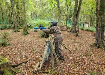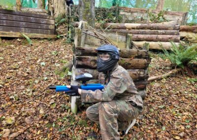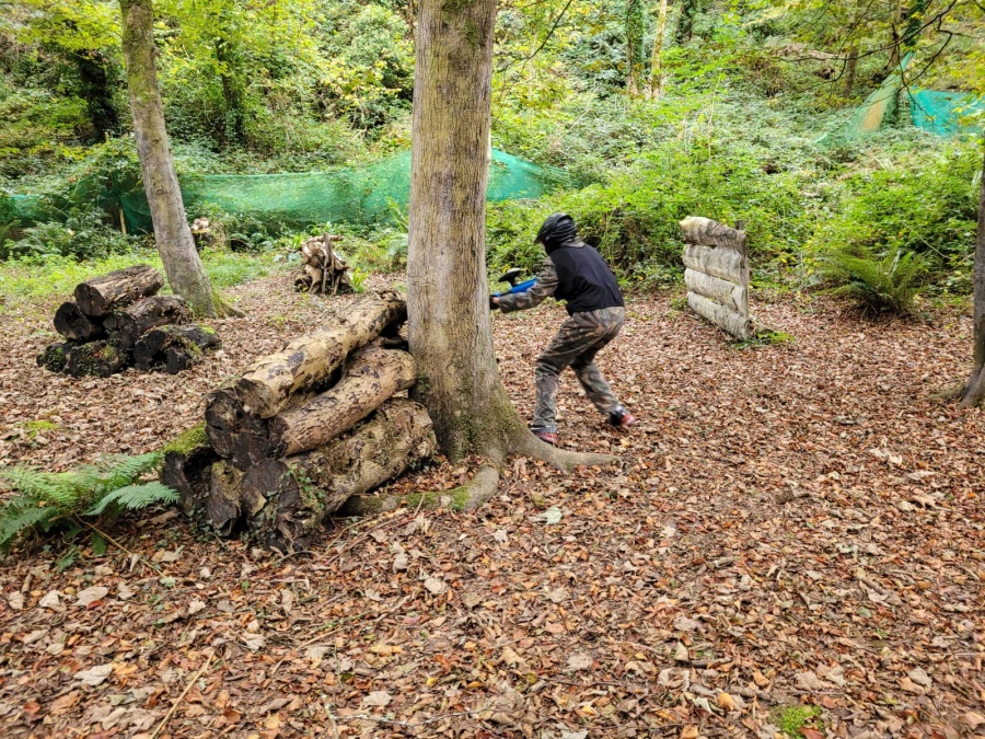 Group of boys and an adult in paintball gear pose for a photo in a wooded area.