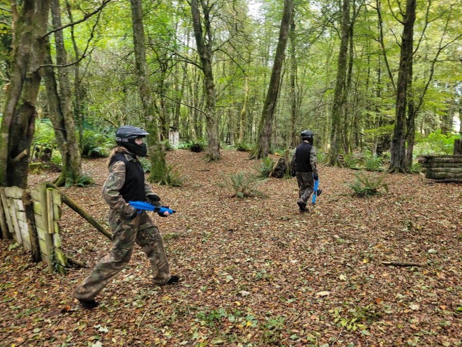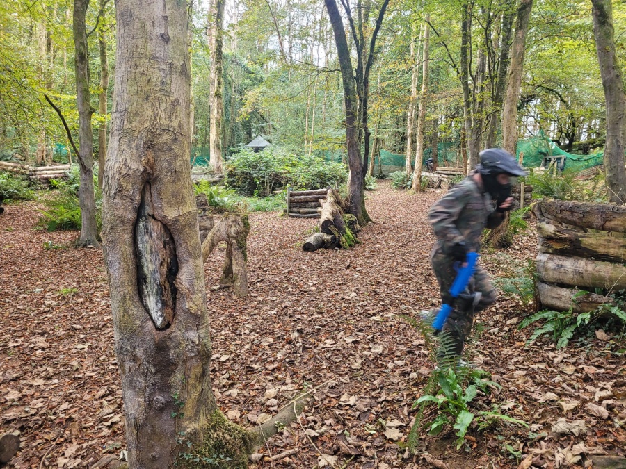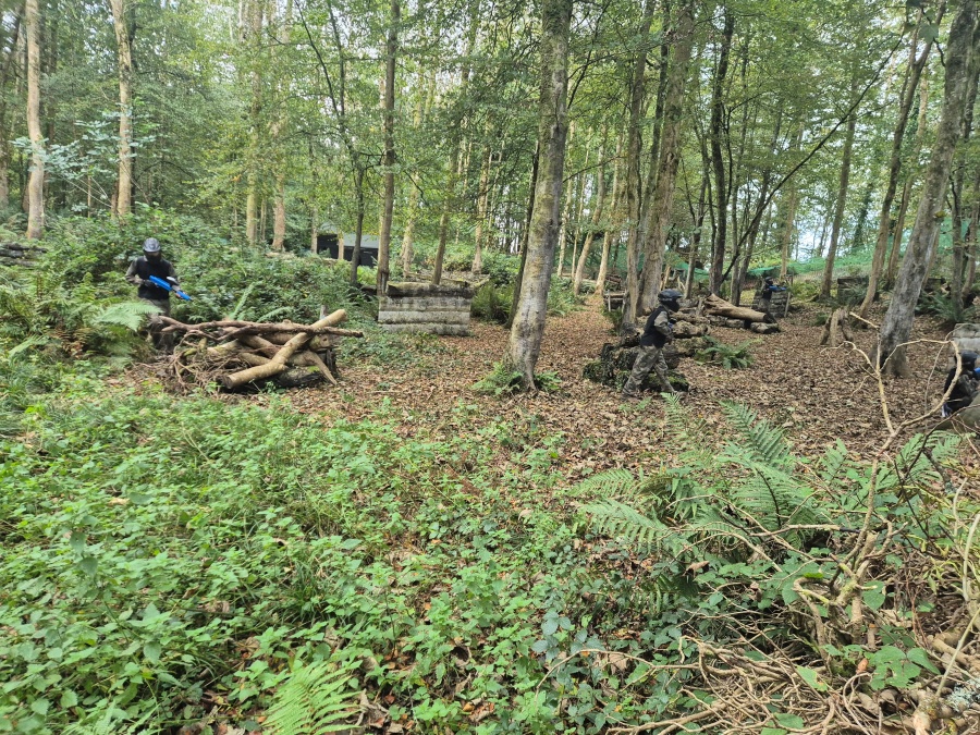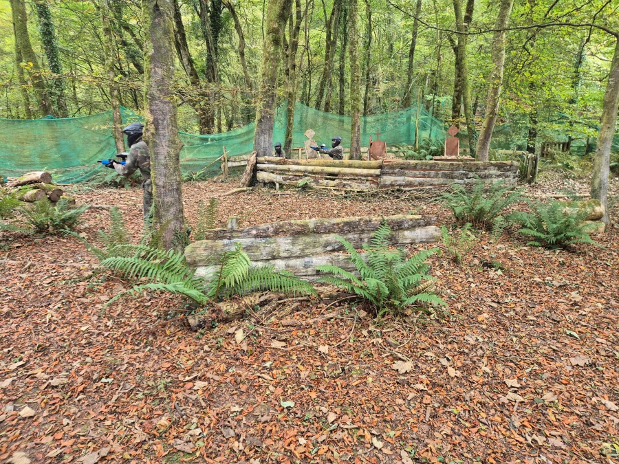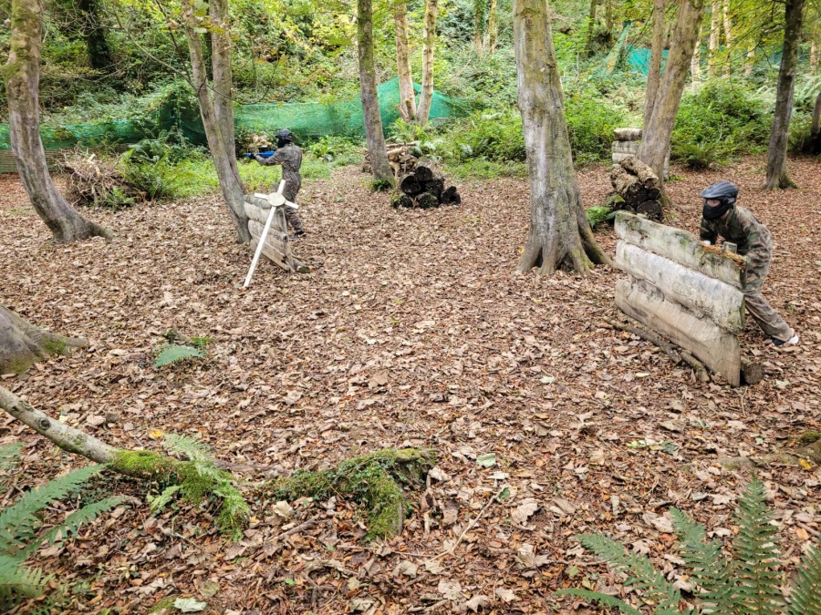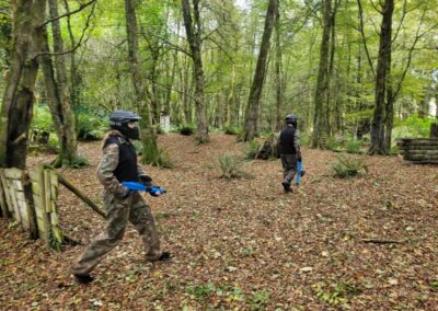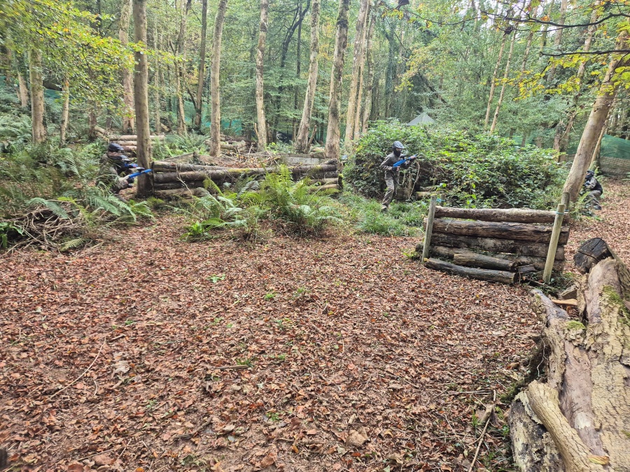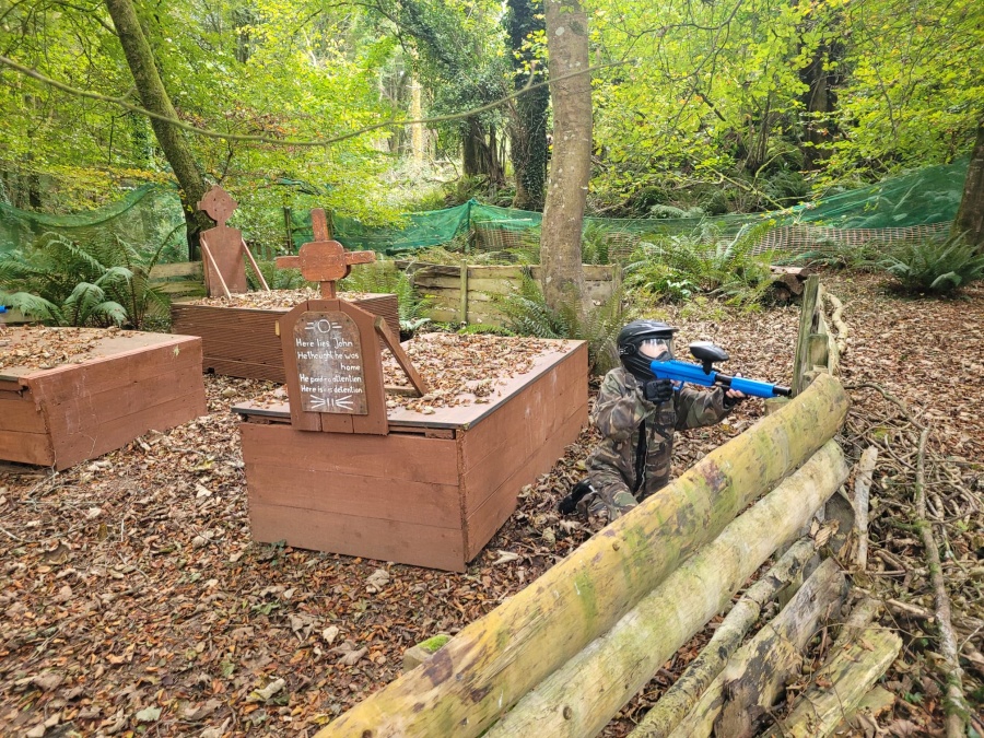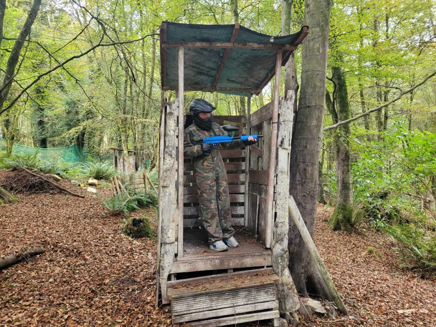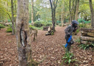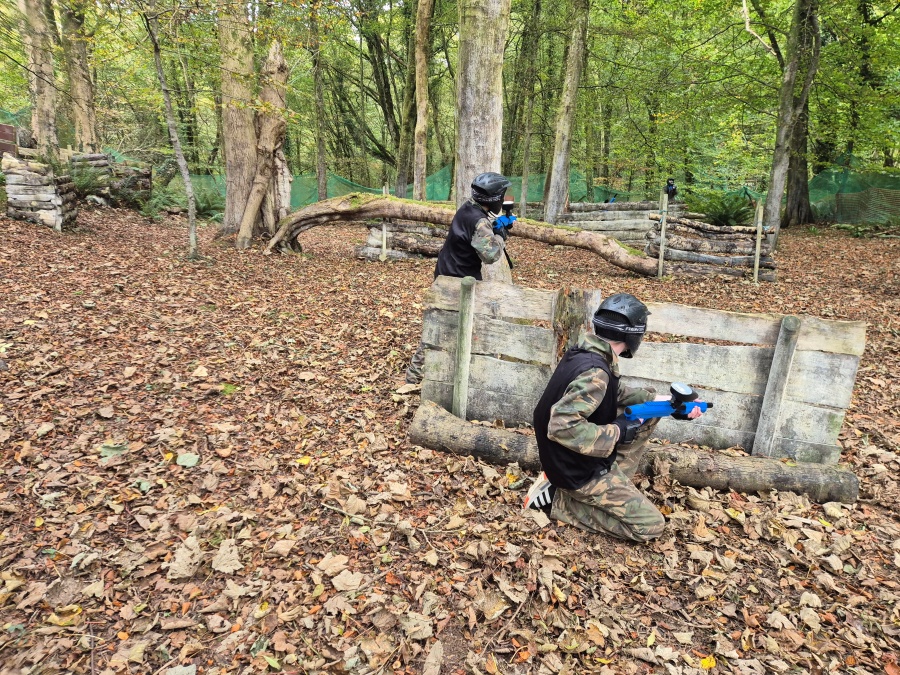Group of boys and an adult in paintball gear pose for a photo in a wooded area.